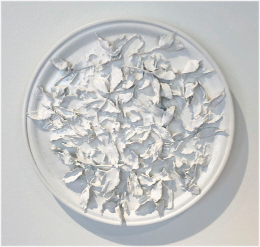 Tutti i lavori in mostra - rigorosamente bianchi - alludono semioticamente al tema del candore e della naturalità e rappresentano un delicato accumulo di fregi e fogliame forgiato dall’artista con gesso, pittura ad olio, cotone e carta e sono completati da cornici realizzate dall’artista senza soluzione di continuità con il resto dell’opera.